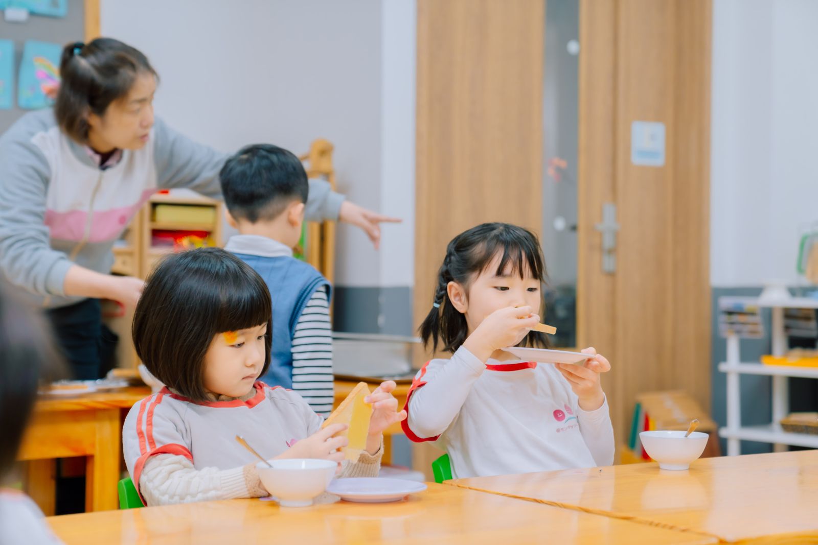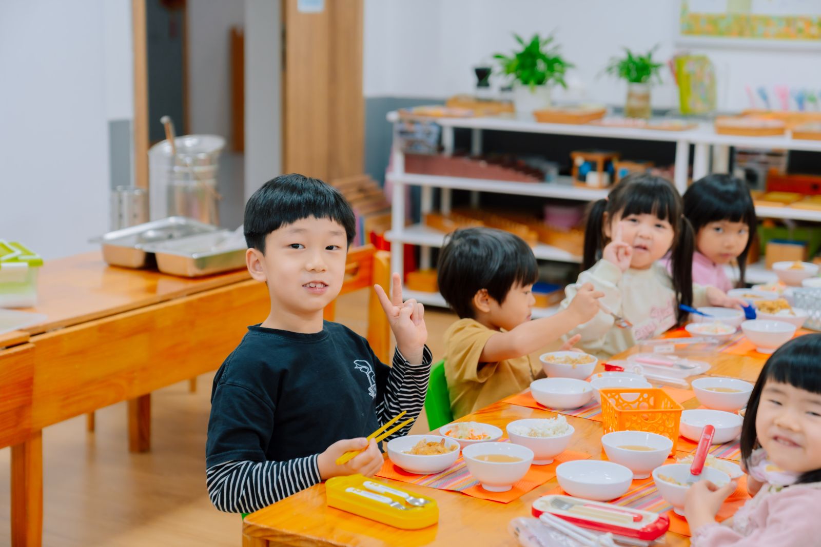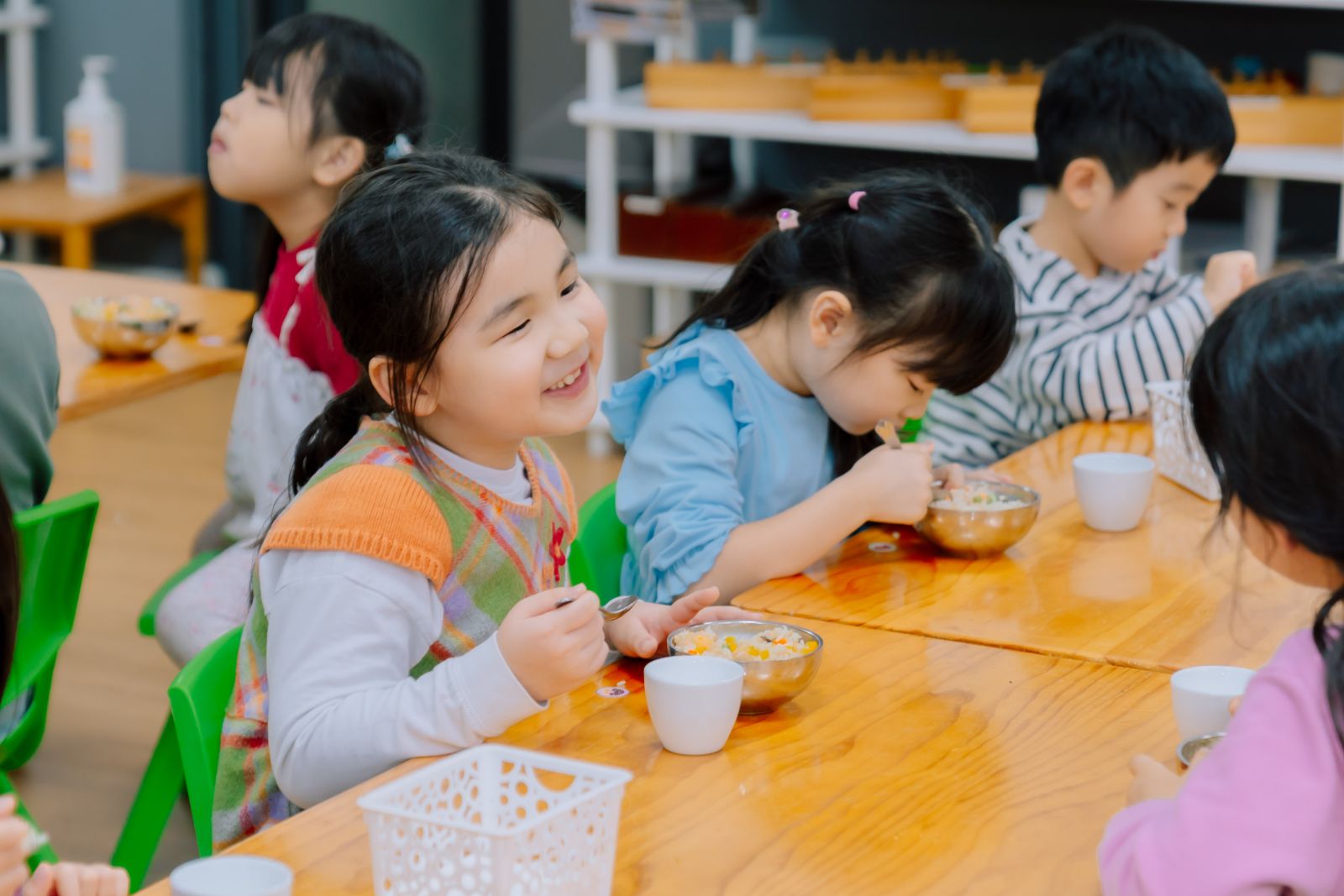 午前中の活動がおわったら、みんな楽しみのお昼です。お友達と一緒に食べるとおいしいね。